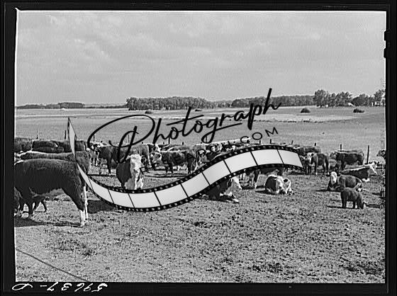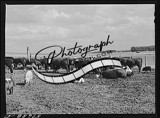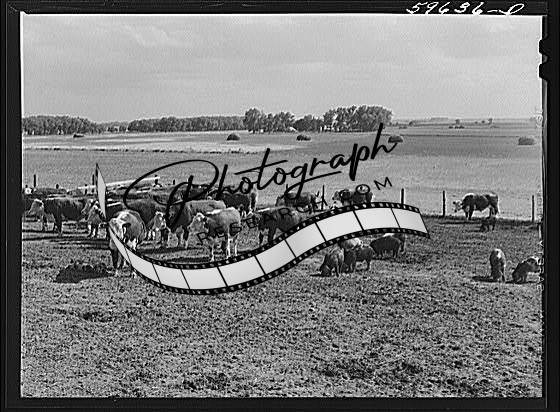 Title: Hereford steers in feedlot on Tom Reed farm. They are fattened and ready for market. Mr. Reed said that all of the trees in the background had been planted by farmers and ranchers not very long ago as wind breakers. His mother told him that when his father first brought her there from Iowa she used to stand at the window and cry when she looked across the plains and saw the train going back east. That was about six or eight miles away, but now you can only see a mile or two. He has seventy head of cattle in feedlot and 250 head on grass