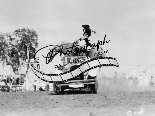 King Tut goes over,Woman on Horseback,leaping over convertible automobile,rodeo