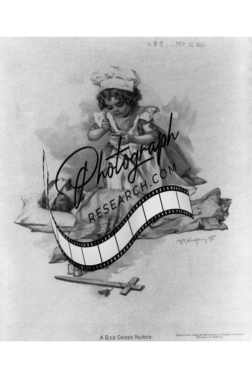 A Red Cross nurse,2 small girls playing nurse & patient,c1899,Muad Humphrey