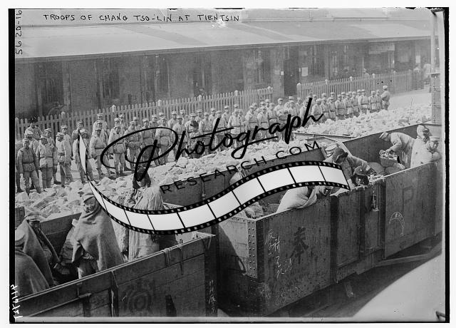 Troops,soldiers,train cars,transportation,fences,Chang Tso-Lin,Tientsin,China