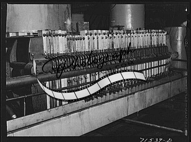 Title: Bags full of olive pulp in hydraulic presses for extraction of oil. The pulp is pressed two different times under differet degrees of pressure and this produces two distinct qualities of oil. Lindsay, California