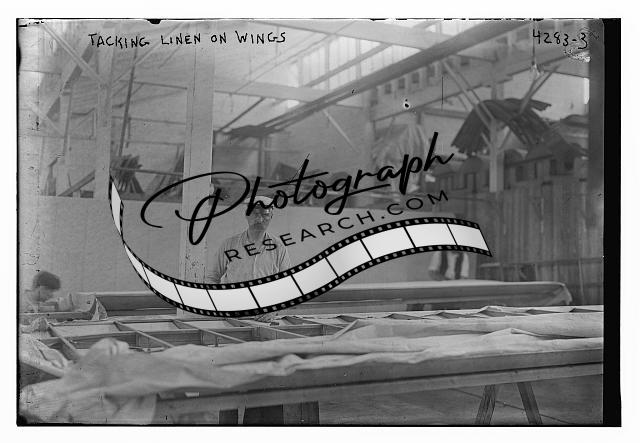 Tacking linen on wings of plane,man with hammer,employment,aviation,Bain News