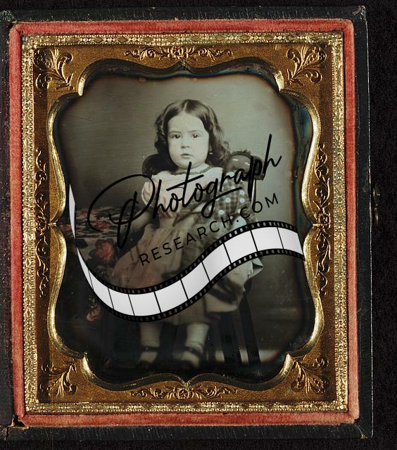 Unidentified Child seated beside table,table cloth,holding black rag doll,c1852