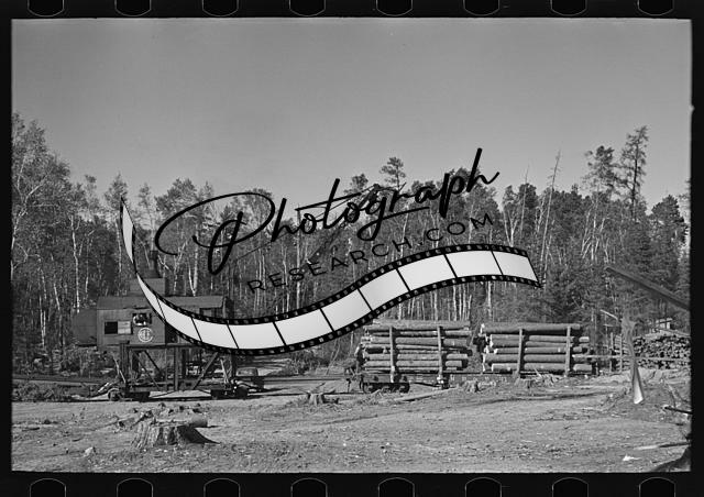 Loading device moving railroad cars full of timber,camp near Effie,Minnesota