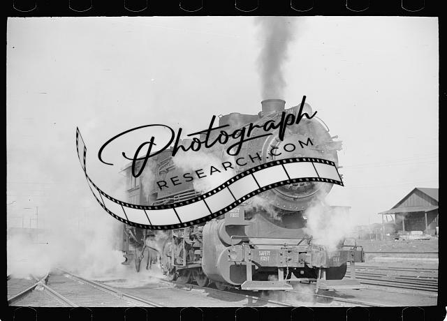 Locomotive in railroad yards along river,St. Louis,Missouri,MO,Rothstein,FSA