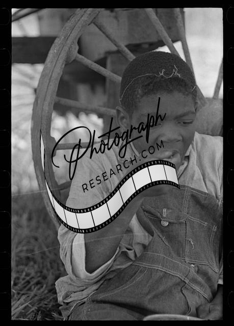 Boy eating lunch by wagon in sugarcane field near New Iberia,Louisiana,LA,FSA