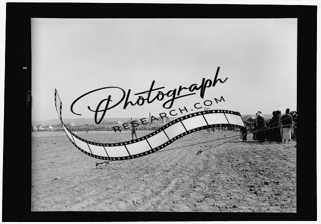 Title: Close of the 1930 locust campaign. Bedouins racing and feasting at Beersheba on June 30th, 1930. The winning camel on his final stride