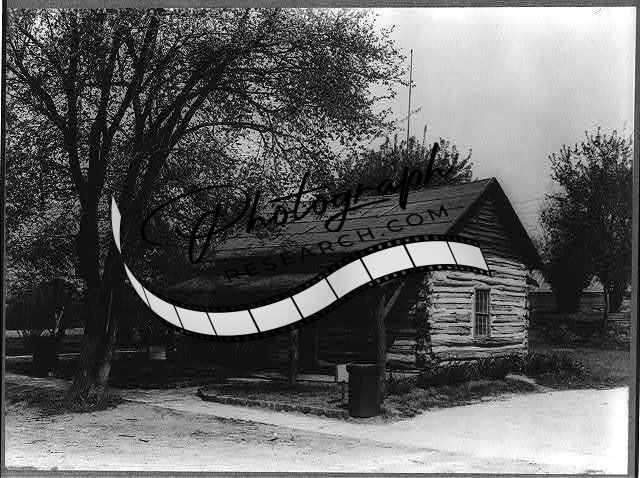 Summary: Photograph shows exterior of an old dilapidated log cabin.