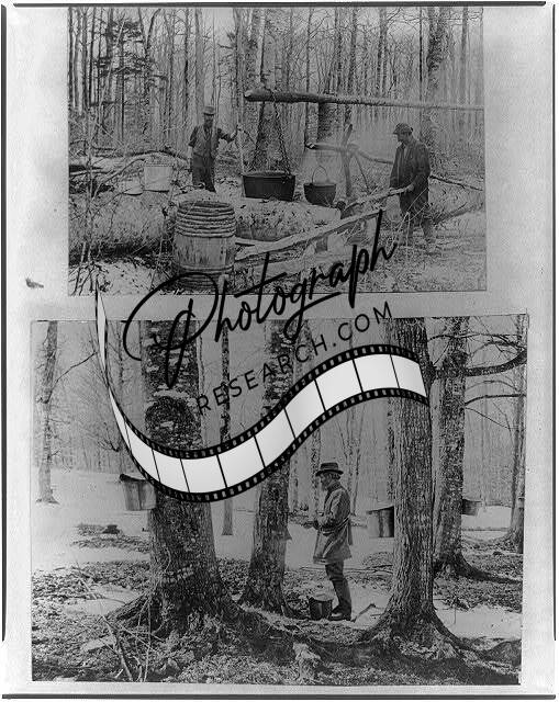 Gathering & Processing maple syrup,c1900,man boiling sap,cauldrons,woods,maple