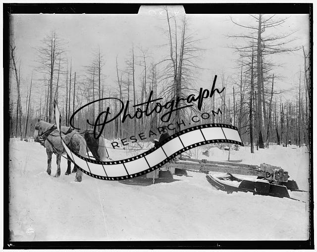 Logging,sled,lumber industry,trees,sleighs,snow,winter,horses,Michigan,MI,1880