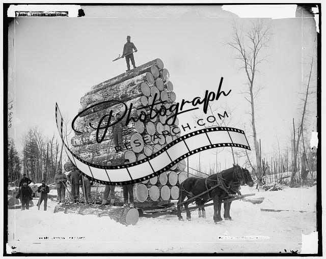 Logging,big load,lumber industry,sleds,sleighs,logs,horses,snow,Michigan,MI,1880