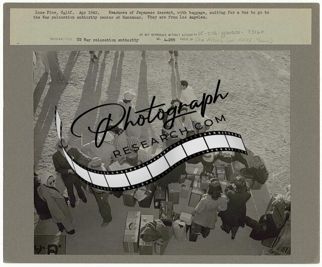 Lone Pine, Calif. Apr. 1942. Evacuees of Japanese descent, with baggage, waiting
