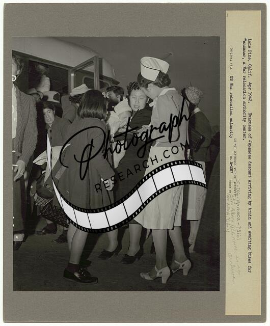 Lone Pine, Calif. Apr. 1942. Evacuees of Japanese descent arriving by train and