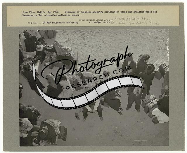 Lone Pine, Calif. Apr. 1942. Evacuees of Japanese descent arriving by train and