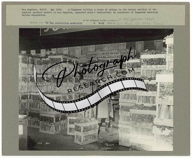 Los Angeles, Calif. Apr. 1942. A Japanese holding a crate of celery in the celer