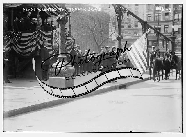 Traffic Squad Review,flag presented to squad,New York,NY,horses,1907