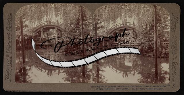 From the edge of lake under beautiful wistaria bowers, west to semi-circular bridge, Kameido, Tokyo, Japan