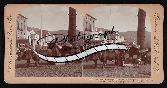 Ox team and sledge - the only "carriage" used in Funchal, Madiera [[i.e. Madeira]]