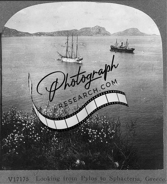 Looking from Pylos to Sphacteria,Greece,Two ships on water,August 13,c1926