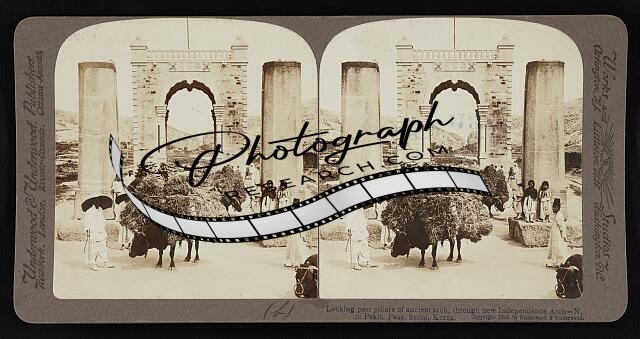 Looking past pillars of ancient arch, through new Independence Arch--N. to Perki