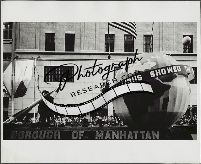 [[Detail view of parade float labeled "Borough of Manhattan" displaying large wor