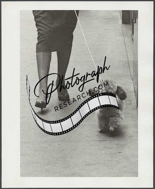[[Dog walking - detail view of small dog on a leash, bottom-half of woman in fram