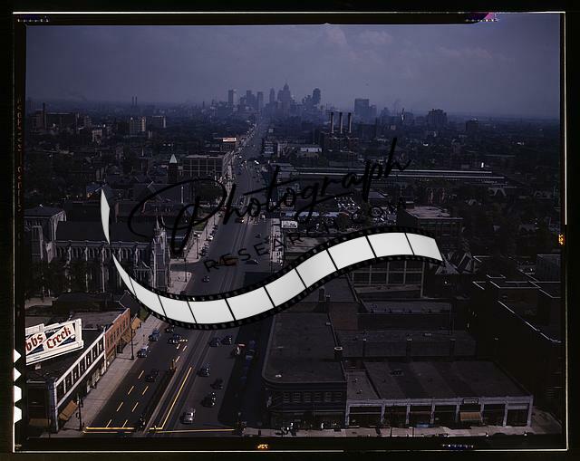 Looking east toward Rackham Building,streets,roads,Detroit,Michigan,MI,1942