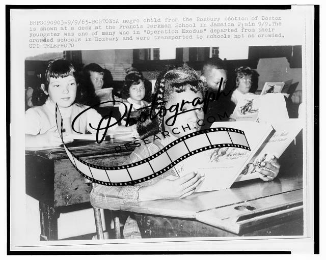 A Negro child from the Roxbury section of Boston is shown at a desk at the Francis Parkman School in Jamaica Plain