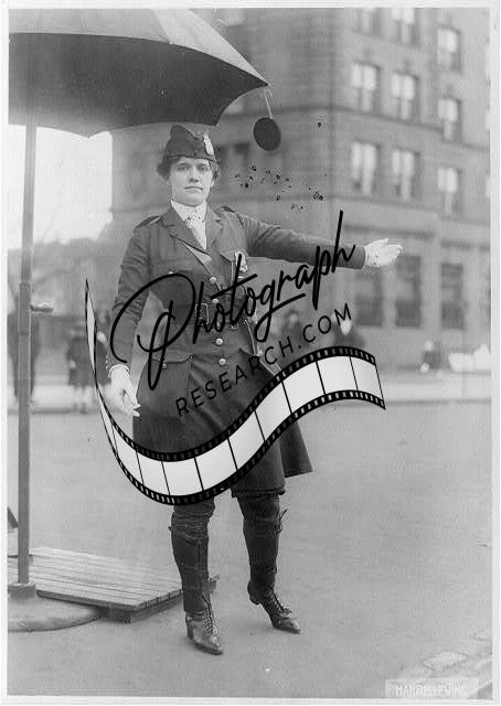 Mrs. L.A. King,directing traffic as policewoman,c1918,women employment,umbrella