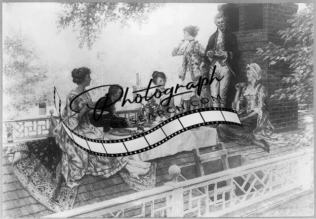 Colonial High Tea,4 ladies and 2 gents having tea on roof of building,c1911