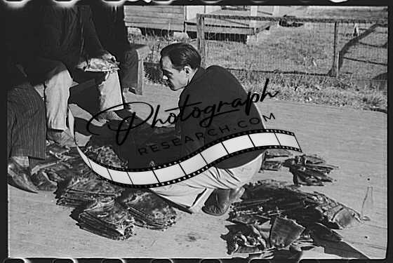 Title: Grading muskrats while fur buyers and Spanish trappers look on, during auction sale on porch of community store in St. Bernard, Louisiana