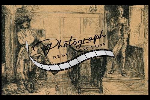 Summary: Drawing shows a partially nude couple on a bed, gazing fearfully at an apparition in full armor with a skull head, entering the door. Christophe was the pen name used by French artist Georges Colomb for the illustrations and comic drawings he made between 1887 and 1904. He is credited with the first modern comic strip, La Famille Fenouillard, begun in 1889. After 1904, he largely abandonded his art work and devoted himself to an academic career in natural history.