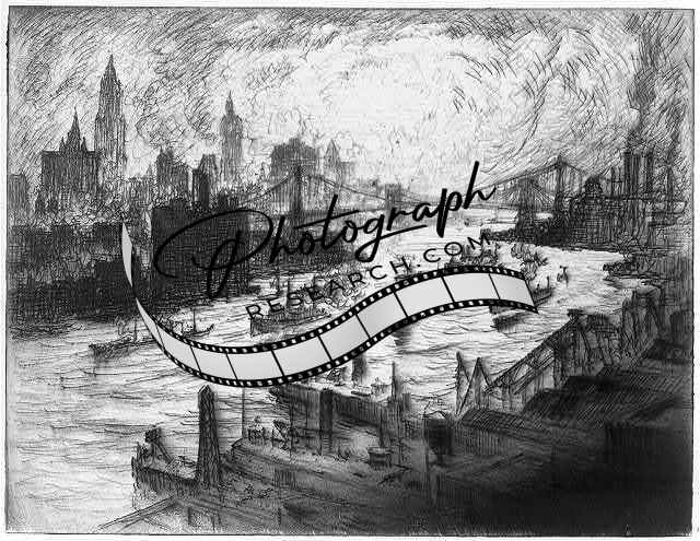 Sunset from Williamsburg bridge,1915,Joseph Pennell,Cityscape,Boats