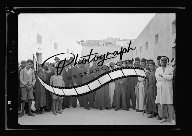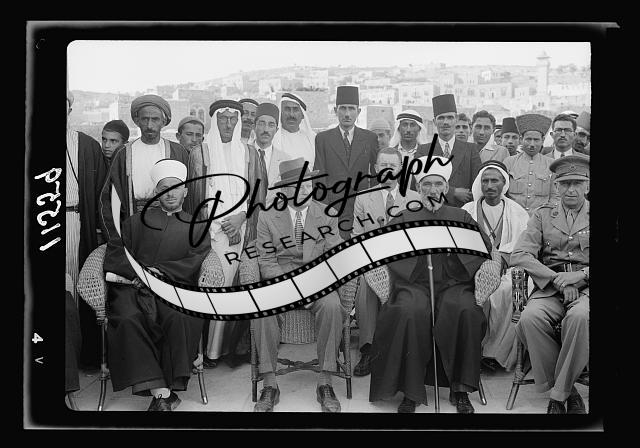 Title: Loyalty meeting in Hebron. Group of notables on school roof. Mr. Keith Roach, Mufti of Hebron, etc.