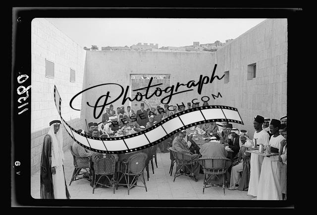 Title: Loyalty meeting in Hebron. Group of notables on school roof. Mr. Keith Roach, Mufti of Hebron, etc.