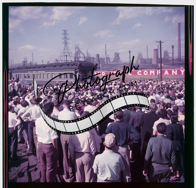 Candidate Dwight Eisenhower speaking,crowd,whistle-stop event,steel mill,1952