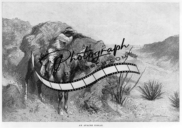An Apache Indian,horseback,aiming rifle toward covered wagon,Arizona,AZ,1891