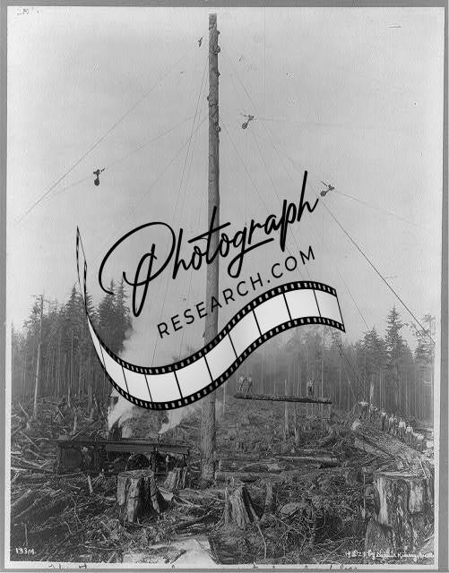 Lumbering operations,Cascade Mountains,Washington,WA,steam machine,log scaffold
