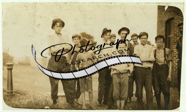 Title: Sunday morning at Lynchburg Cotton Mill (Va.) Ed Tolley, the smallest, said 15 years old, but that is very doubtfull. Others in these three photos, Lucien Tolley, Herbert Aultico, Henry Daly, John Crawley. (See my report for addresses.) Most of these boys could not spell own names. All claimed to be over 14, but their disputes showed 'These's a reason.' They get from three to four dollars a week and some pay board. One said, 'I get all over $2.60.' Some were surely under twelve. All work. Lindsey Witt has been working there 2 years. Dewey Anderson, three years. Myron Cole, some time. Location: Lynchburg, Virginia.
