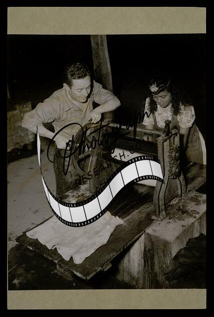 Ecuador - rubber - Luis Carbo turns press as Olga feeds coagulated latex into press which forms thin sheet of rubber ready for drying and shipping