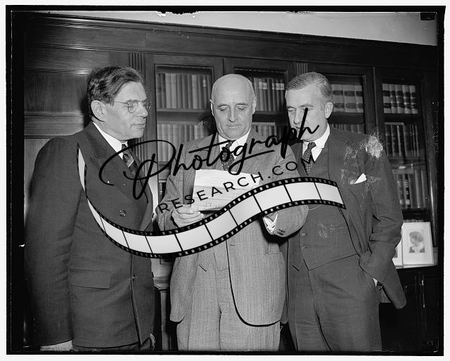 Title: TVA congressional investigators hold first meeting. Washington, D.C., April 27. With their membership now complete, The Joint Congressional Committee to investigate the Tennessee Valley Authority met today for the first time. They laid plans to round up their staff of lawyers, investigators, and clerks, some of whom will probably go south to do preliminary work. In the photo, left to right: (seated) Sen. Lynn Frazier, (R) North Dakota; Sen. Vic Donahey, (D) of Ohio, Chairman; Sen. James J. Davis, (R) Penna.; and Rep. Thomas A. Jenkins, (R) Ohio. Standing, left to right: Rep. Charles A. Wolverton, (R) New Jersey; Rep. William J. Driver, (D) Arkansas; Sen. H.H. Schwartz, (D) Wyoming; Rep. R. Ewing Thomason, (D) Texas; and Rep. James M. Mead, (D) New York, Co-Chairman, 4/27/38