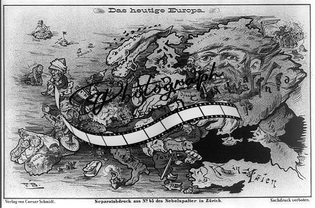 Summary: Print depicting the state of German affairs following August 1, 1914 (the date it entered the first World War), showing a gigantic male figure, representing Germany, wearing armor and holding a sword, with rows of well disciplined soldiers marching below toward the ruins of a building spewing smoke on the left. Flanking the upper half of the giant figure are a Russian bear with its mouth open in agony and mid-riff bones exposed, an aged, toothless and hairless British lion with a monkey, representing Japan, sitting in the loop of its tail, and on the left, a frightened Gallic cock representing France.