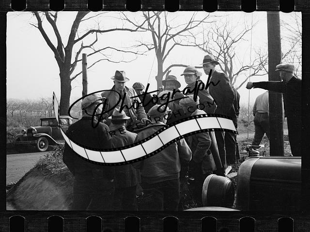 Workers,laborers,men,automobiles,roads,crowds,cars,trees,1935