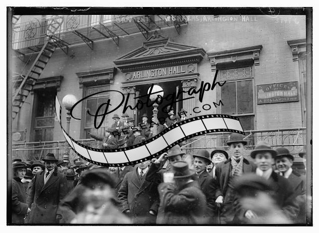 Garment workers,Arlington Hall,men crowded out front of building,Bain News