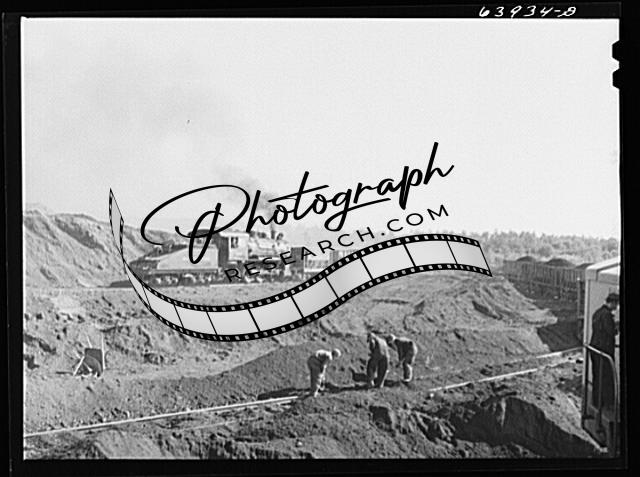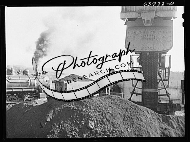 Title: Electric shovel loading iron ore into railroad cars, eight cubic yards per shovelful. Mahoning Mine. Hibbing, Minnesota