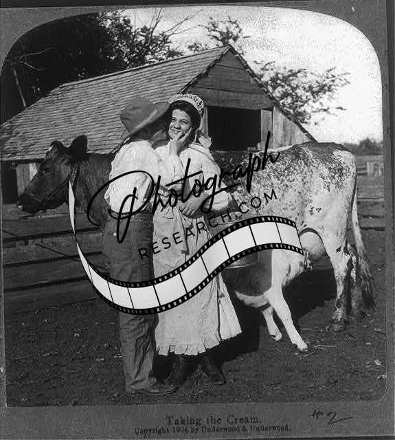 Farmer kissing Milkmaid,Calf nursing cow,Courtship,Humor,c1904,Smiling,Domestic