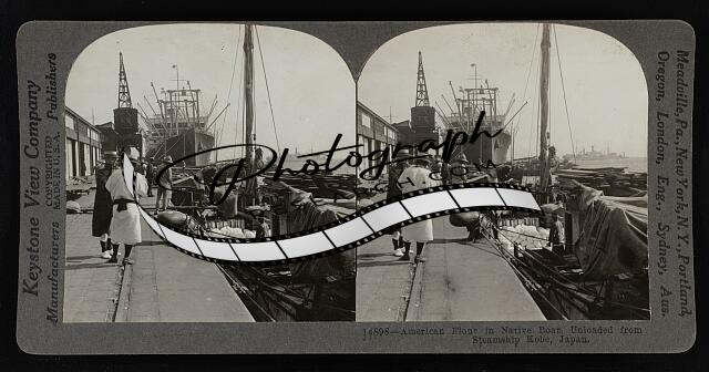 American flour in native boat,unloaded from steamship,Kobe,Japan
