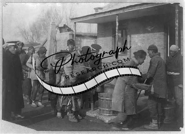 Chinese soldiers supervising distribution of famine relief rations,1909,soup lne