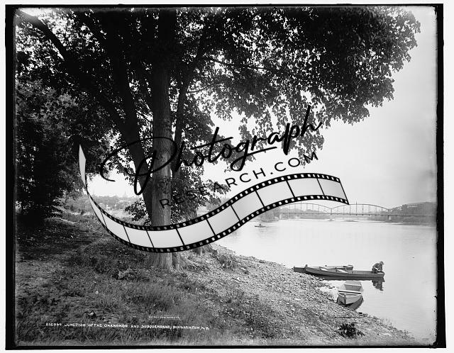 Junction,Chenango,Susquehanna,River,boats,canoes,bridge,Binghamton,New York,1890
