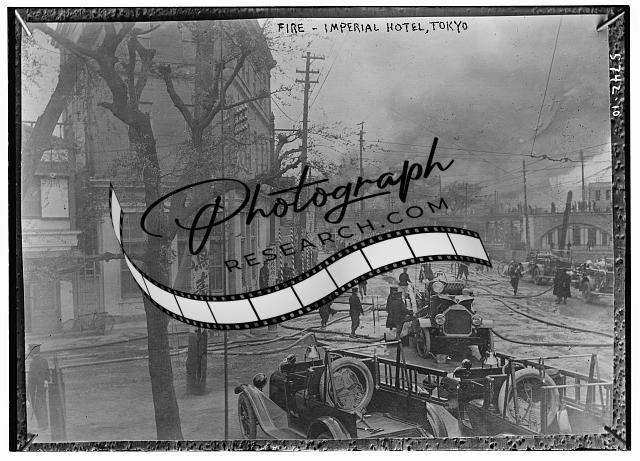 Fire,destruction,fire engines,hoses,fighters,streets,Imperial Hotel,Tokyo,Japan